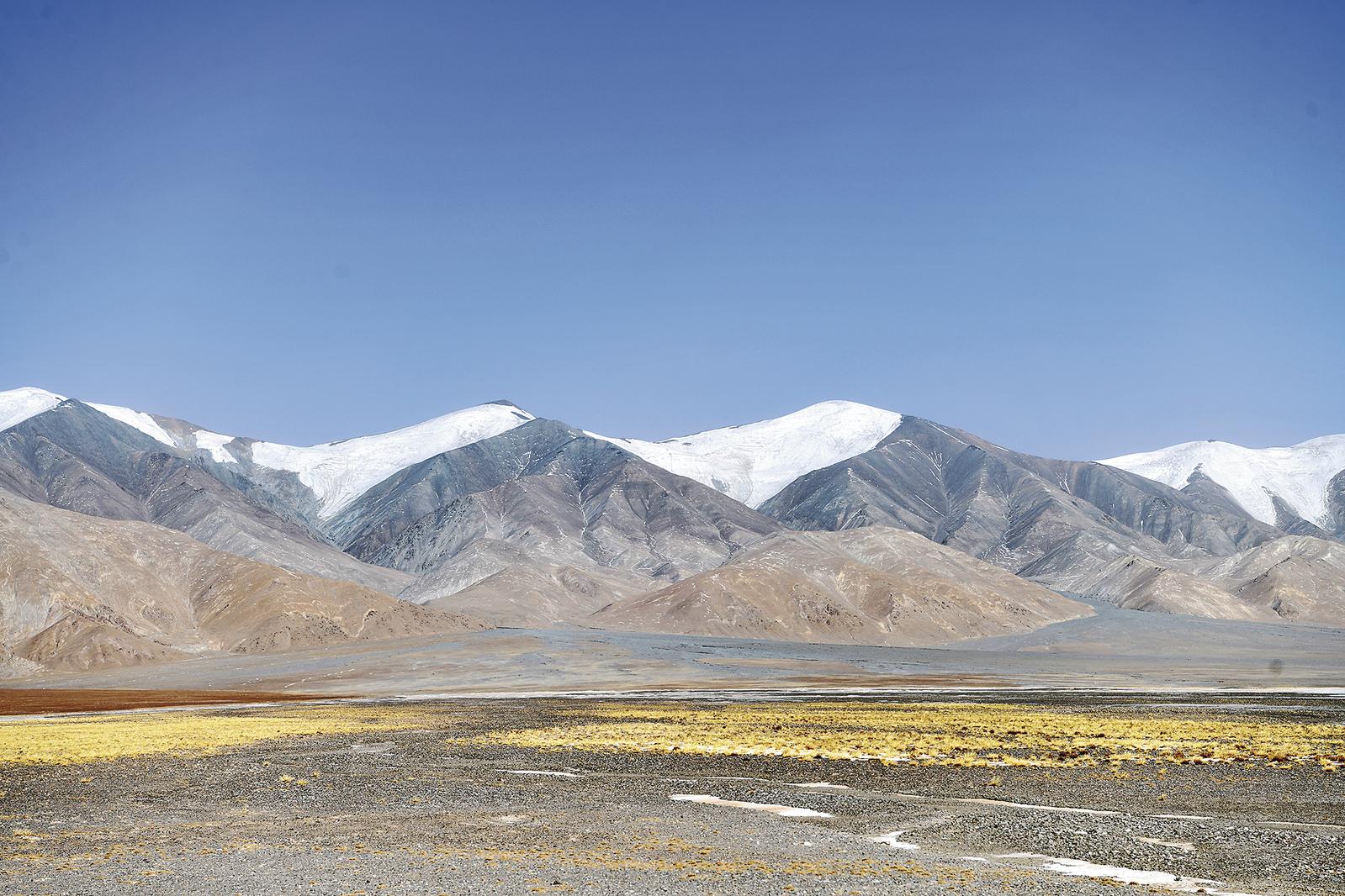 库赛湖的一侧是昆仑雪山,雪山脚下,湖畔之侧,车队缓慢行驶。