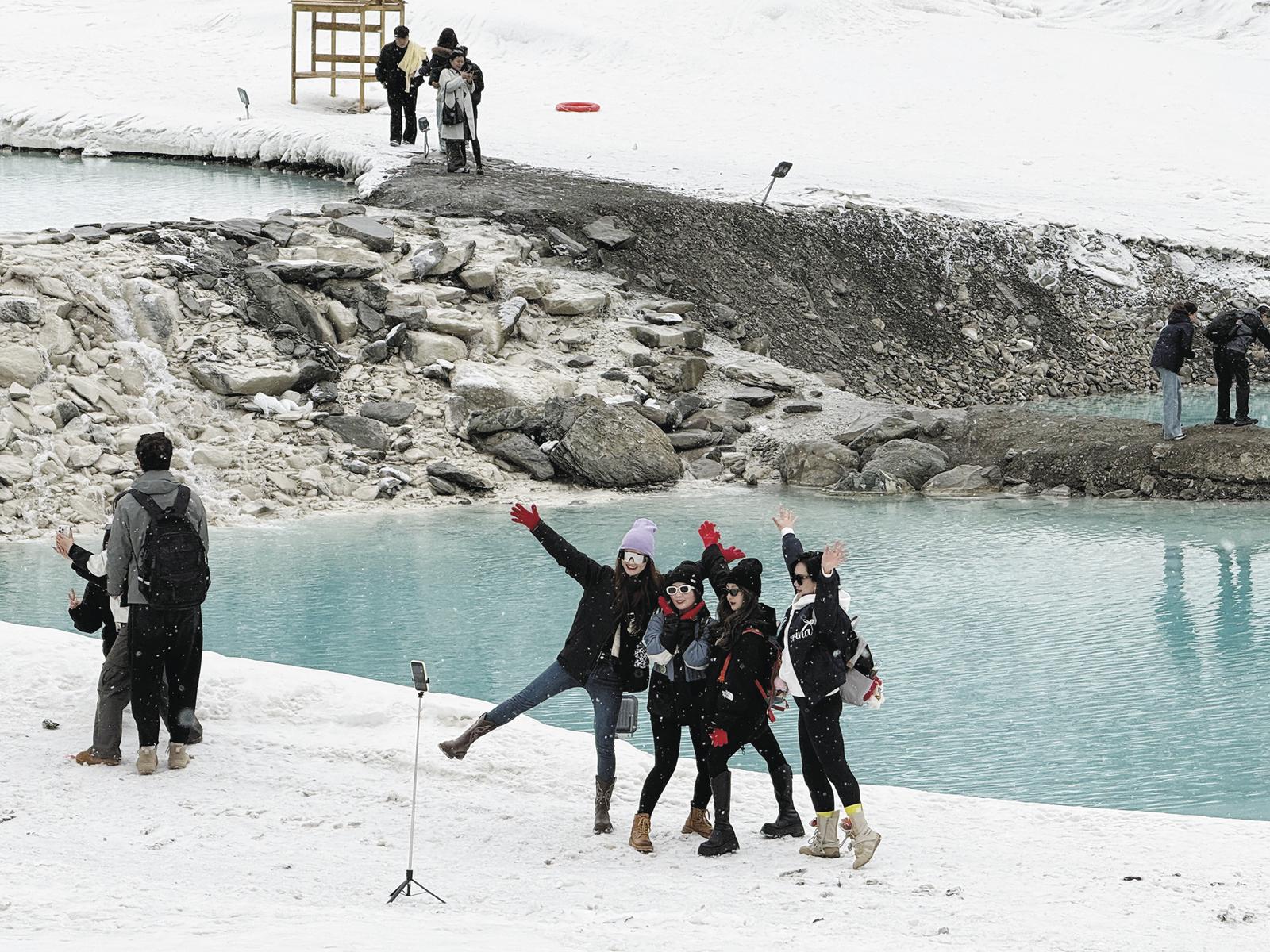 “头往上抬,仰望天空……”连心湖畔,游客相互指导拍照姿势,将身后的皑皑雪峰与澄澈湖水一同框进镜头,定格这份高原独有的诗意美好。“终于圆梦!第一次在小红书刷到岗什卡雪峰就被深深吸引,今天特意从兰州赶来,成功打卡人生第一座雪峰!”游客郭嘉话音刚落,身旁的朋友彭千文接着说:“与其他同类型景区相比,我觉得岗什卡雪峰更加原生态,刚下摆渡车,我们就被湛蓝的湖水吸引了,景色美得让人挪不开眼!”