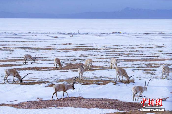 2023年3月25日,成群的藏羚羊在位于青海省玉树藏族自治州的世界自然遗产地可可西里觅食。马铭言 摄