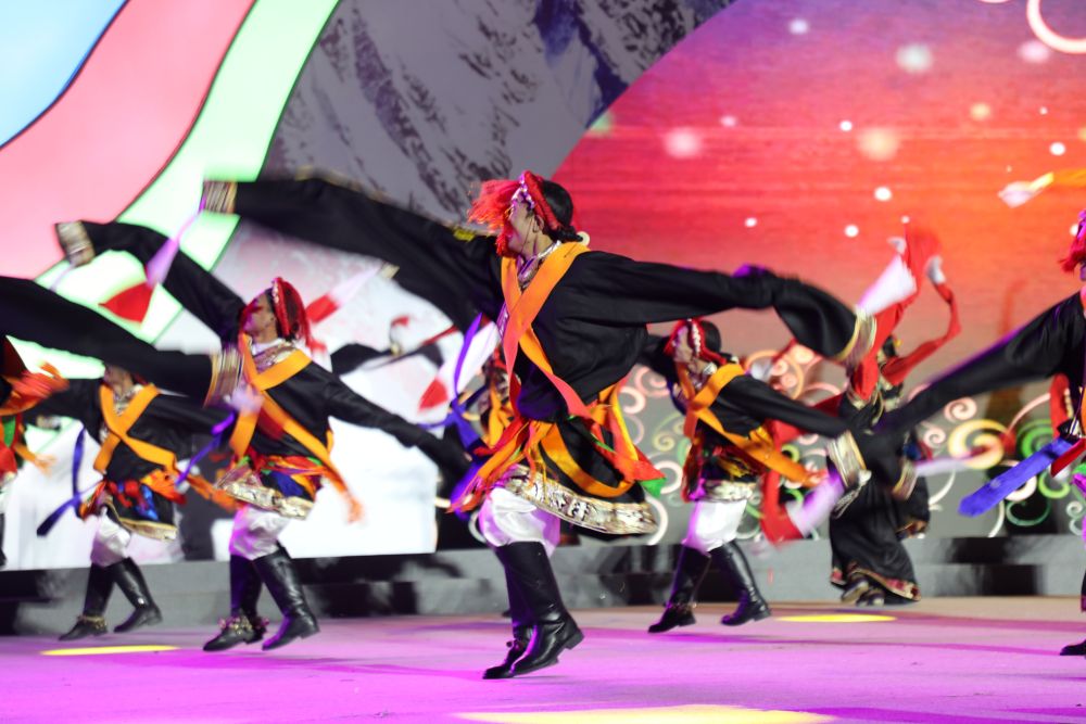 2025年8月1日,在青海省玉树藏族自治州举办的尼泊尔商贸文化交流活动现场,玉树州的舞蹈演员在表演节目。柳泽兴 摄