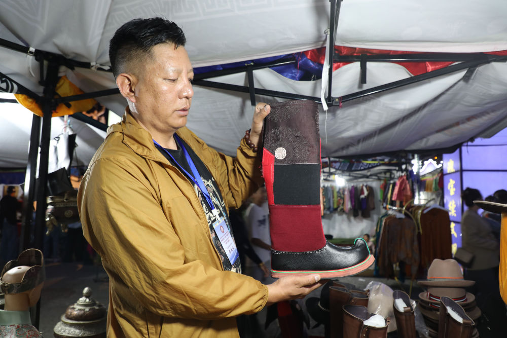 2025年8月2日,青海省玉树藏族自治州商户索南给记者展示用尼泊尔进口布料制作的靴子。柳泽兴 摄