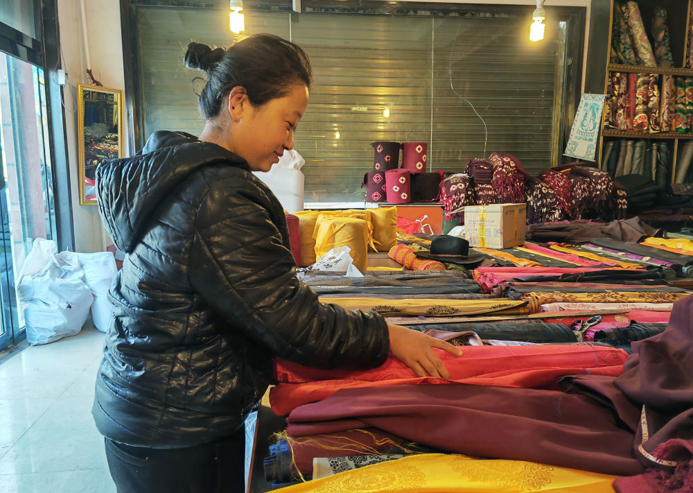 2025年11月29日,来自尼泊尔的美周在位于玉树藏族自治州的商铺销售尼泊尔布料和服饰。柳泽兴 摄