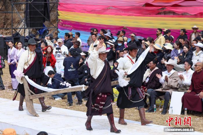 图为村装秀现场身着民族服饰的农牧民展示农耕文化。中新社记者 刘忠俊 摄