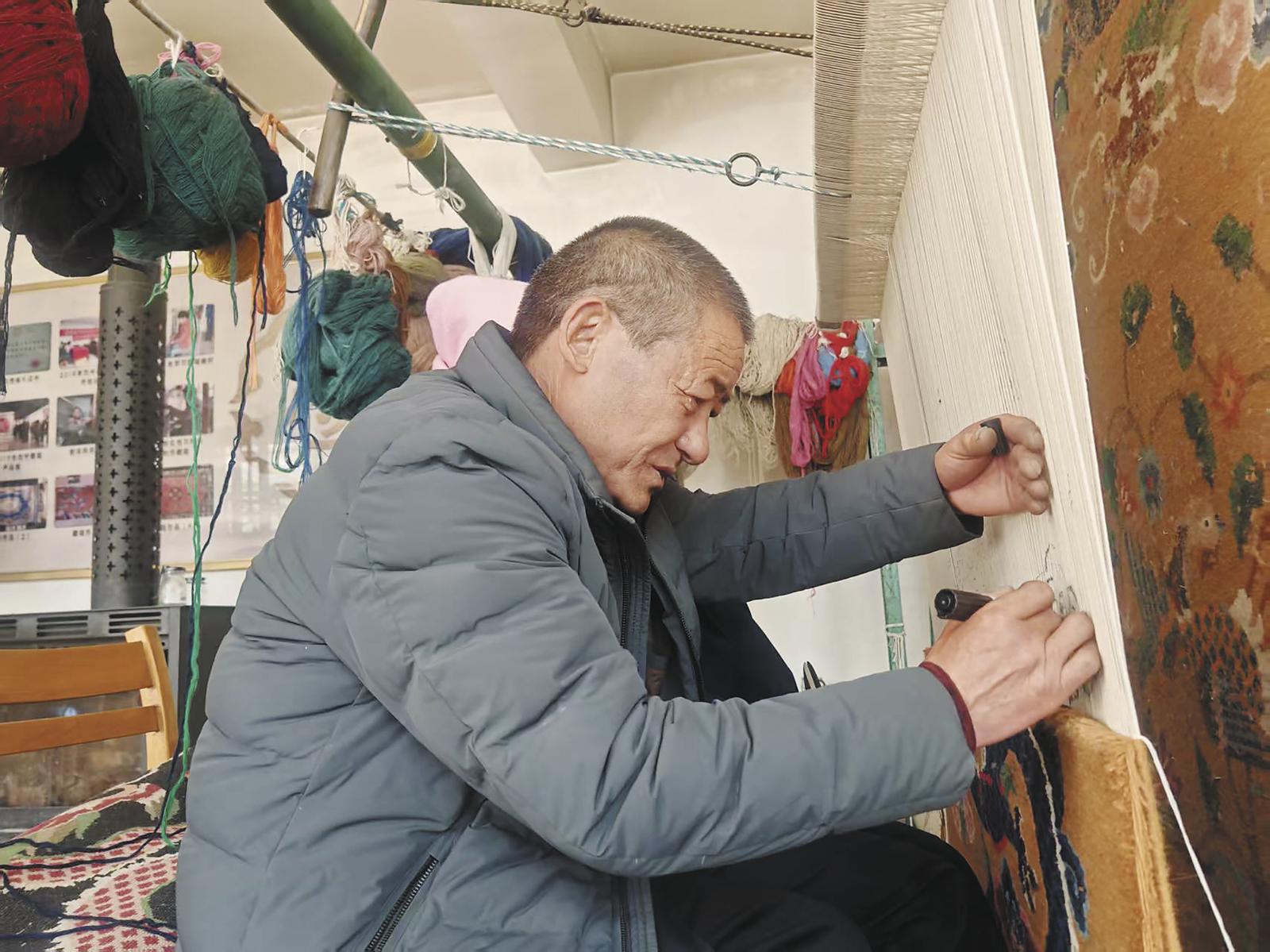 杨永良在织藏毯。