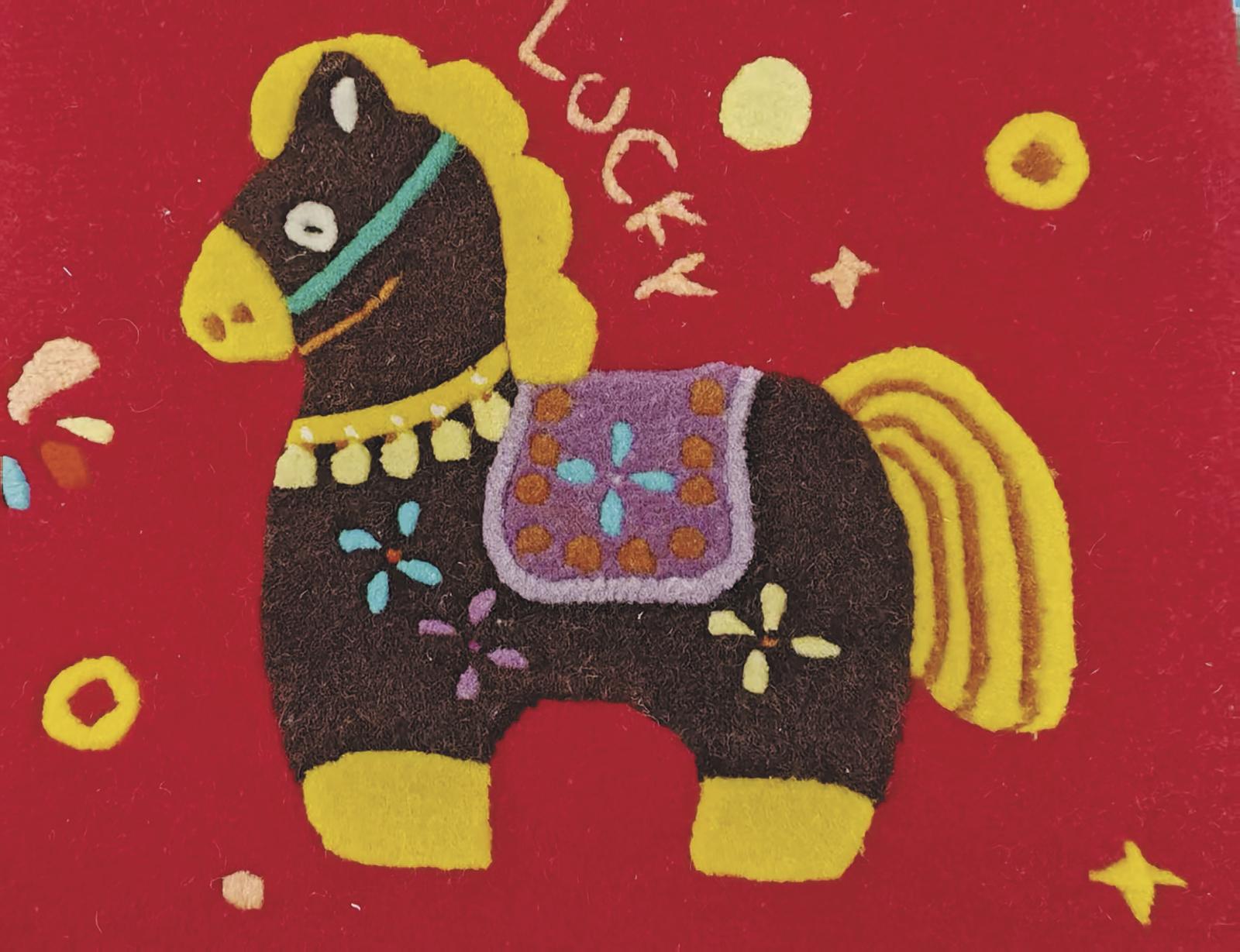 院子一侧,是传习所的展厅。墙上的玻璃展柜中,杨永良祖父织就的藏毯被悉心珍藏。历经两百余年,其色彩略显暗淡,但毛质依然紧实。展厅内一同展出的,还有另一批风格截然不同的作品——他儿媳制作的创新藏毯,图案更为轻松活泼,标价从几十元到几百元不等。参观者常常在这里停下脚步,挑选一条可以随手带走的小毯子。