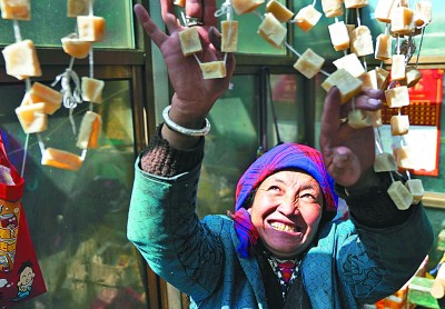 我国海拔最高乡——西藏山南市浪卡子县普玛江塘乡,牧民生产生活条件得到极大改善。图为当地妇女在晾晒奶渣。新华社发