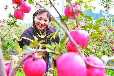 消费扶贫让超亿元优质农产品出藏。图为西藏林芝市米林县羌纳乡林巴村村民在果园里摘苹果。新华社发