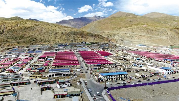 在这座现代化的小区里,一排排黄色的藏式民居整齐划一,迎风招展的五星红旗格外醒目,小区周边学校、医院、农贸市场等配套设施一应俱全。沐浴着和煦的阳光,孩子们在巷子里奔跑嬉闹,老人们围拢在一起拉家常。