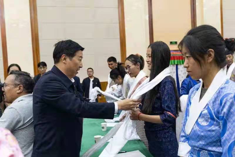 10月14日下午,湖北省第九批援藏工作队领队、山南市委副书记、常务副市长李修武为即将赴湖北就业的大学生献哈达。(通讯员 罗洋 摄)