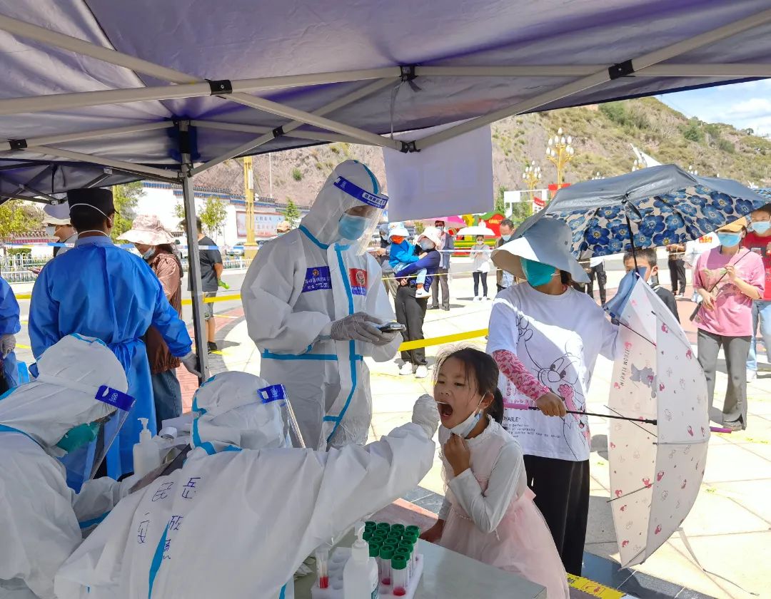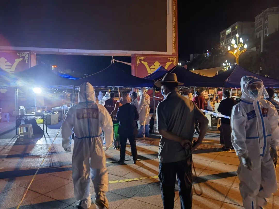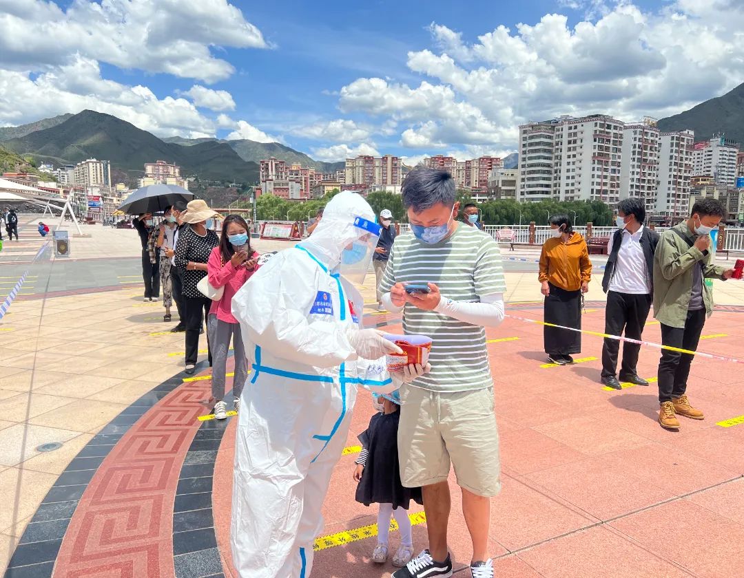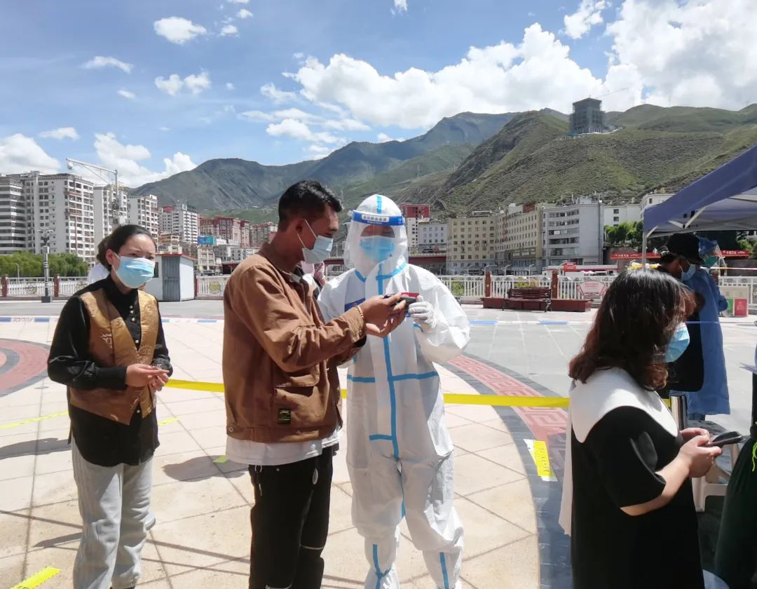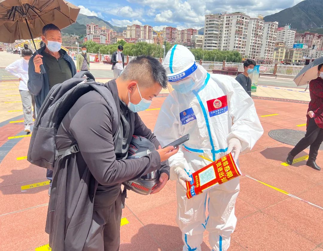 “为了您的安全,请保持1米以上间隔,谢谢。”晚上9点多,在茶马广场,支队三级消防士张兴梁,依然坚守在抗疫一线,维持着排队做核酸的长队。从早上7点开始,张兴梁和其他消防队员已坚守了14个多小时。“西藏昼夜温差特大,白天防护服里面衣服都湿透了,但是到晚上这个点已经干了,正好不用换衣服了。”张兴梁打趣的说到。