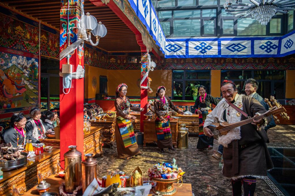 戴着“全国劳动模范”胸章的平拉(右二),正一边弹唱扎念琴一边跳舞(1月22日摄)。新华社记者 孙非 摄