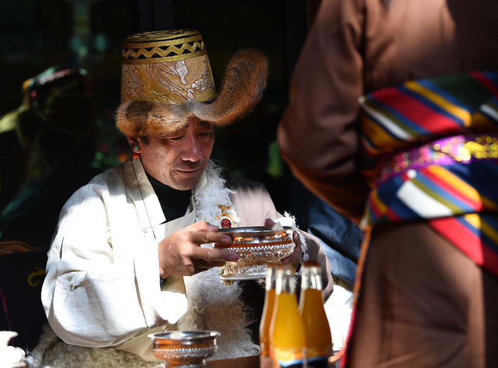 平拉在喝青稞酒。他胸前佩戴的全国劳模奖章是他最珍贵的宝贝(1月22日摄)。新华社记者 晋美多吉 摄