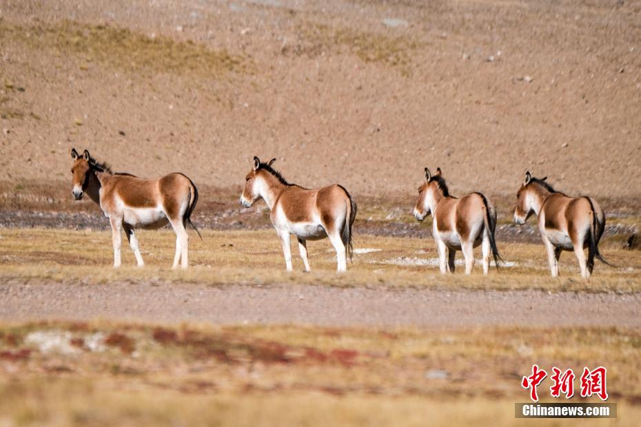 图为10月3日,羌塘草原上的一群藏野驴悠闲觅食。中新社记者 江飞波 摄