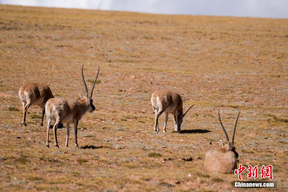 图为10月3日下午,一群藏羚羊在羌塘草原觅食。中新社记者 江飞波 摄