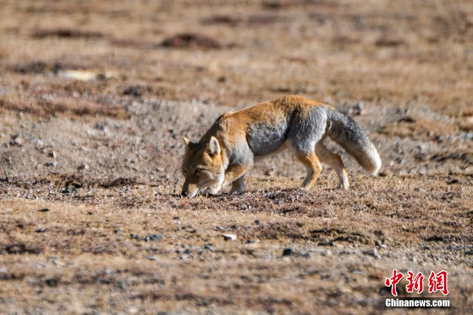图为10月3日,西藏那曲双湖县的草原上,一只藏狐正在嗅草原鼠兔的洞穴,寻找猎物。中新社记者 江飞波 摄