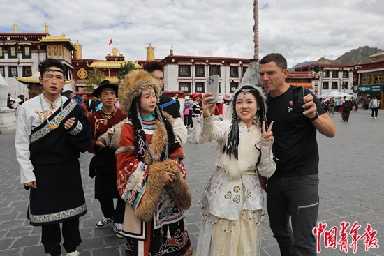 9月2日,西藏拉萨市八廓街,来自俄罗斯的巴德里(右一)与身穿藏族传统服装的年轻游客合影留念。近年来,来拉萨旅游,到八廓街、布达拉宫广场拍一套藏服写真,已经成为进藏旅游年轻人的“标配”。中青报·中青网记者 孔斯琪/摄