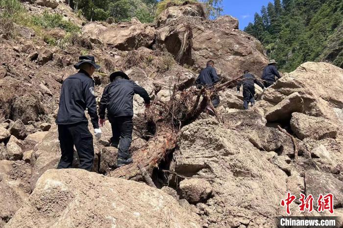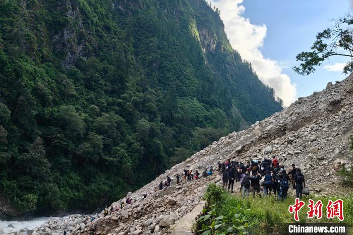 图为吉隆出入境边防检查站民警带领滞留尼籍边民通过塌方路段前往吉隆口岸。郭章统 摄