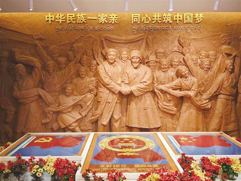 一楼序厅正中“民族大团结”大型浮雕,正厅辅以图片、视频以及实物展品等多种形式生动诠释了西藏自古以来就是中国领土不可分割的一部分。沿着阶梯上行,二、三楼展厅则逐一展现了“封建农奴制度统治下的旧西藏”的苦难岁月、“西藏的民主改革与社会制度跨越”的壮阔历程以及“特殊关怀辉煌成就”部分,全方位、多角度地展现了中国共产党带领西藏各族人民团结奋斗,从胜利走向胜利的昂扬风貌。展览让人见证了西藏发展的巨大成就,更让人深刻感受到了索县人民在党的领导下,追求美好生活、实现自身梦想的坚定信念和不懈追求。