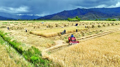 西藏日喀则市白朗县巴扎乡近年推广“藏青3000”等青稞新品种和机械化种植,图为农民在收获青稞。新华社发