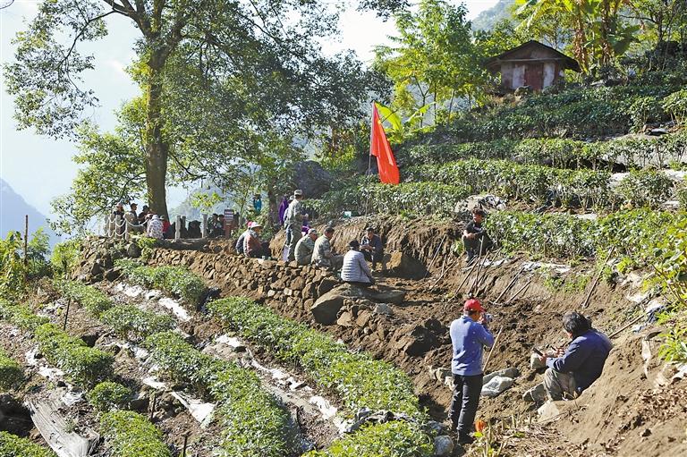 墨脱县德兴村茶果园内,工作人员正在护理树苗。 记者王珊 谢筱纯 摄