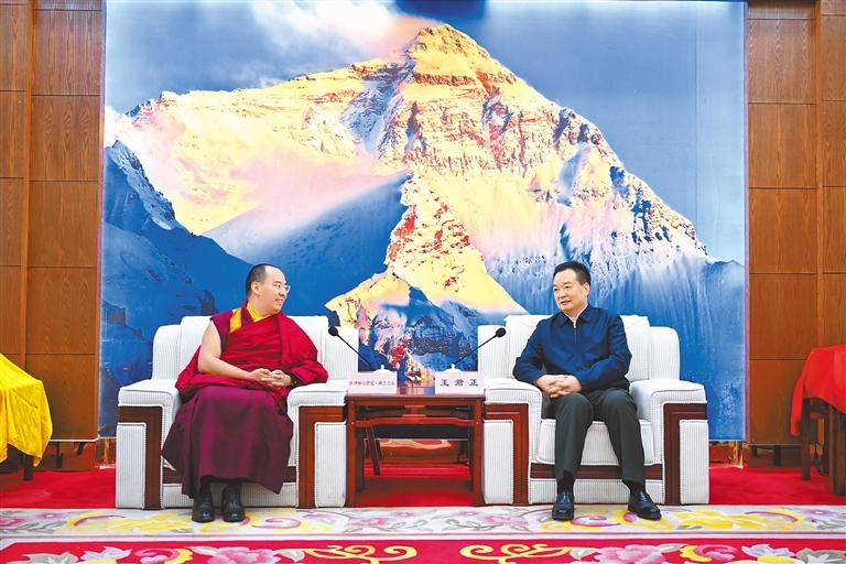 调研结束后,王君正在日喀则市会见了班禅额尔德尼·确吉杰布,对其在藏各项活动的顺利开展、圆满成功表示祝贺。王君正指出,班禅额尔德尼·确吉杰布回藏履职以来,深入贯彻习近平总书记关于宗教工作、西藏工作的重要指示和新时代党的治藏方略,深入学习宣传“三个意识”,广泛接触基层干部群众和寺庙僧尼,积极宣传党的民族宗教政策,在推进藏传佛教中国化、铸牢中华民族共同体意识、引导信众投身社会主义现代化新西藏建设等方面做了积极有效的工作。希望班禅额尔德尼·确吉杰布进一步学习领会习近平总书记重要指示精神,坚定不移维护祖国统一、加强民族团结,全力维护社会和谐稳定的良好局面;坚定不移推进藏传佛教中国化,对教规教义作出通俗易懂、与时俱进的阐释;坚定不移深化拓展“国家意识、公民意识、法治意识”教育,把各方面力量凝聚起来,奋力推进社会主义现代化新西藏建设。