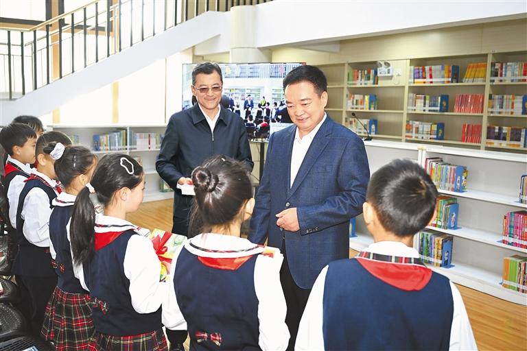 初夏,万物并秀,生机勃发,拉萨市实验小学书声琅琅。王君正走进校园,察看学校环境,参观自然、阅读、书法、体育等教育成果展示,了解学校历史沿革、建设发展、教育教学等情况。他指出,习近平总书记高度重视、亲切关怀少年儿童和少先队工作,多次参加少先队活动,发表重要讲话、作出重要指示。5月27日,习近平总书记致信祝贺中国少年先锋队第九次全国代表大会召开,殷切寄语广大少年儿童,饱含着对大家的深切关爱。要加强爱国主义教育,讲好思政课,着力讲好党的故事、革命的故事、英雄的故事,时刻把祖国和人民放在心中,不忘初心、童心向党,从小听党话、感党恩、跟党走;要积极推广国家通用语言文字,把铸牢中华民族共同体意识根植少年儿童心灵深处,引导他们争做民族团结的小石榴籽,争当学习和践行社会主义核心价值观的小模范。图书馆内,“红领巾小书虫”读书分享活动正在进行,孩子们围坐在一起,与定日县长所乡完全小学学生视频连线,共同分享喜欢的书籍,王君正认真倾听、亲切询问,向孩子们赠送书籍。“祖国的未来和希望在你们身上,要热爱祖国、好好学习、天天向上,从小培养良好的道德情操。”王君正鼓励他们说,要多读书、读好书,从书中汲取智慧和营养,将来做对国家、对人民、对社会有用的人。