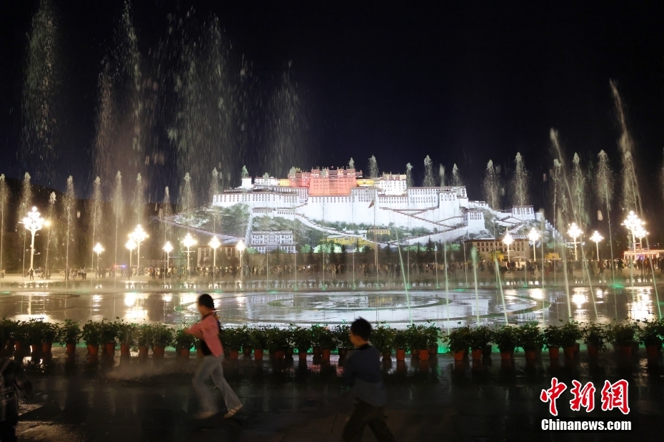 7月7日晚,西藏拉萨布达拉宫广场灯光明亮、喷泉绽放,吸引当地民众与远方游客前来观赏美景。