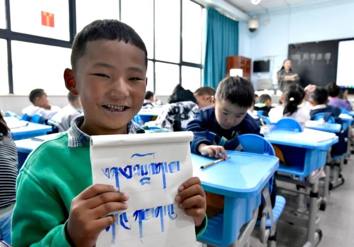 2024年8月20日,拉萨市第一小学一年级八班迎来藏语文课。图为学生展示书写的藏文。中新社记者 李林 摄