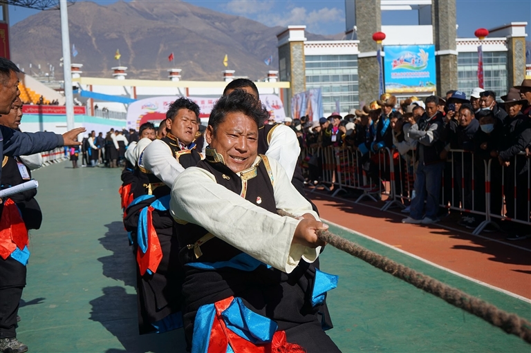 记者置身于赛场,最直观的感受并非竞技的紧张,而是一种蓬勃的生命力在尽情舒展。这里的比赛,呐喊声带着乡音,胜利的欢呼与田间劳作时的号子相互呼应。在极具特色的“押加”比赛(即大象拔河)现场,来自隆子县的扎西达杰成为全场的焦点。他穿着隆子县的传统服饰,面容质朴神情严肃,裁判哨声吹响,与对手反向对拉的瞬间,他全身的肌肉瞬间绷紧,四肢紧紧地“吸附”在地上,那是在千百次挥镐、背负牧草中锤炼出的力量。僵持、角力,在乡亲的“加油”声中,他猛然发力,赢得了比赛。