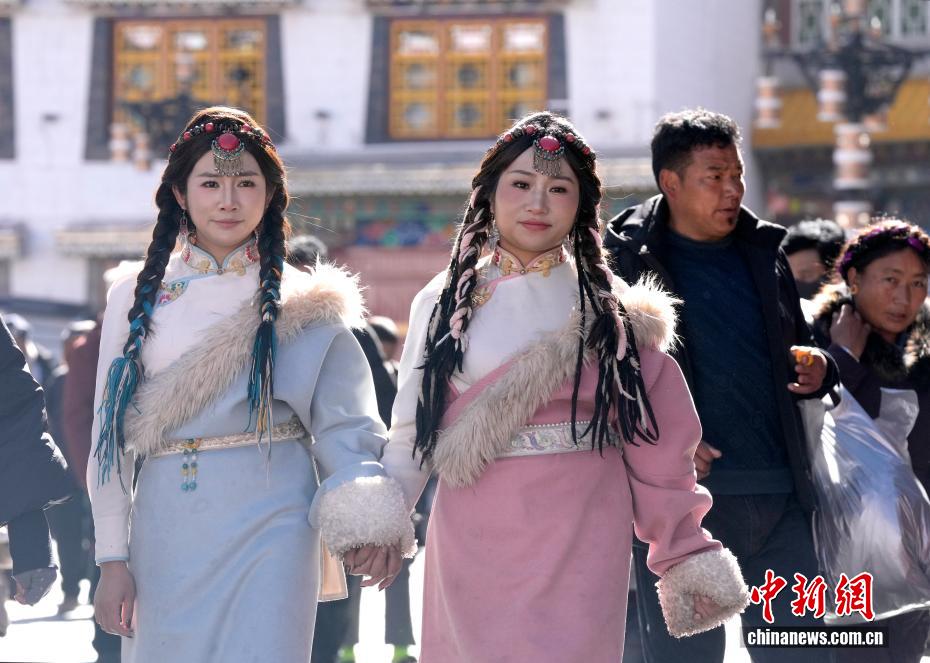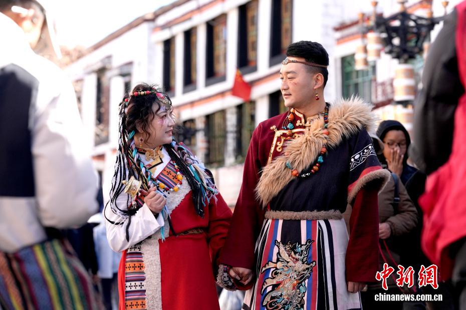 12月24日,游客在拉萨市八廓街拍摄藏服写真。在第八轮“冬游西藏”活动持续推动下,不少游客选择在冬季走进西藏,感受雪域高原的独特魅力。除了免费游览布达拉宫、罗布林卡等景区,体验藏服写真也成为大多数游客行程中的“必选项”。中新社记者 李林 摄