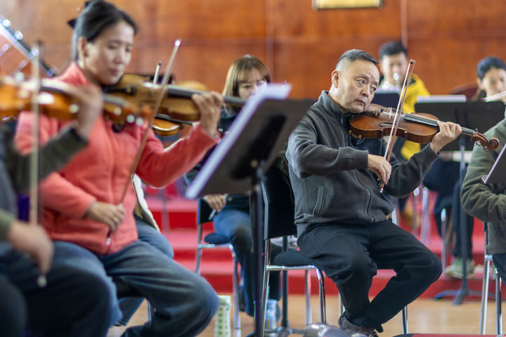 西藏自治区歌舞团小提琴演奏家罗雪莱(右)在进行排练(2025年11月3日摄)。新华社记者 姜帆 摄