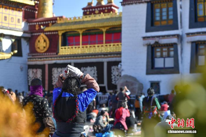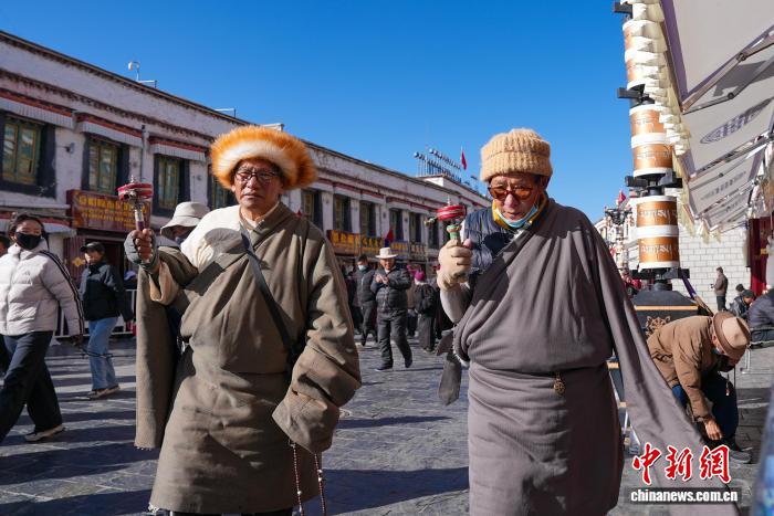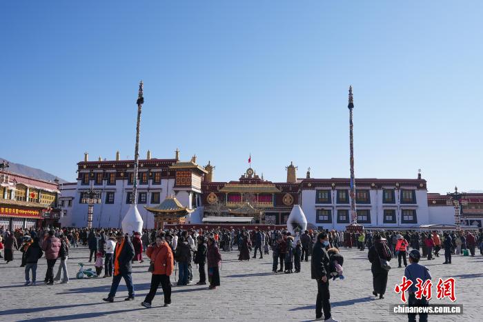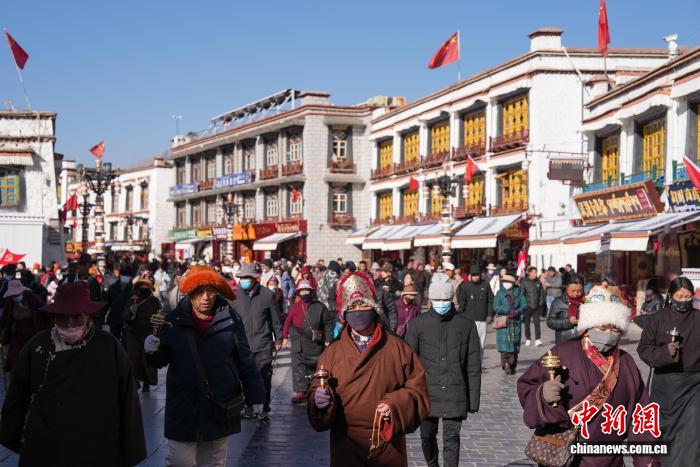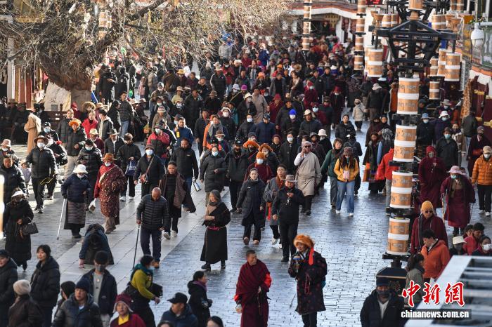 1月14日,雪域高原进入农闲季,西藏及各地藏传佛教信众齐聚拉萨,围绕布达拉宫、大昭寺等地排起长龙,转经朝拜、虔诚礼佛,为众生祈福,祈求风调雨顺。图为信众围绕大昭寺转经。贡确 摄