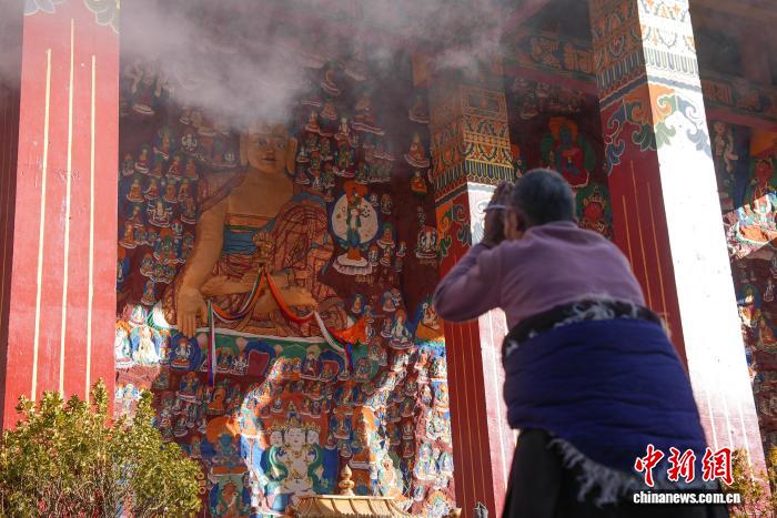 1月14日,雪域高原进入农闲季,西藏及各地藏传佛教信众齐聚拉萨,围绕布达拉宫、大昭寺等地排起长龙,转经朝拜、虔诚礼佛,为众生祈福,祈求风调雨顺。图为信众在千佛岩前磕长头。贡确 摄