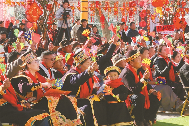 来自羌纳乡岗嘎村的扎西,看完热闹喜庆的文艺演出后,领到了一副寓意吉祥的藏文春联,脸上满是欢喜。他乐呵呵地说:“今年我们家靠着跑运输、出租机械,收入差不多有20万元。不用远走他乡,在家门口就能稳稳当当挣钱。逢年过节,附近还经常举办这么有意思的活动,这么好看的节目,日子越过越红火、越过越舒心。这一桩桩、一件件,都让我们真切感受到了党的关心和关怀。”