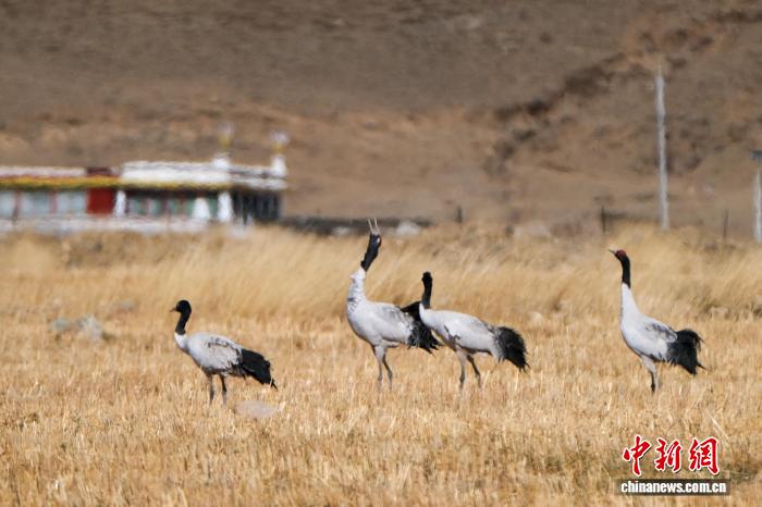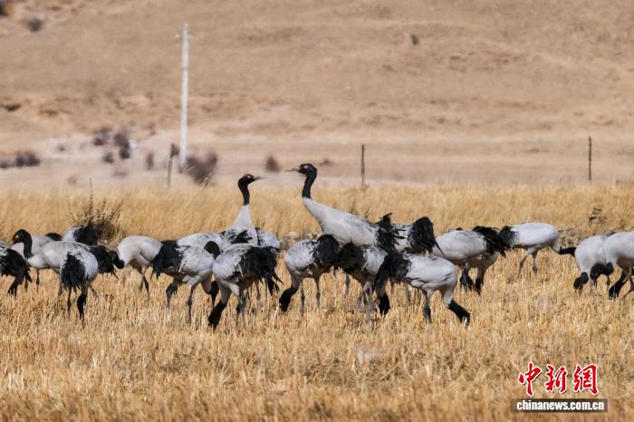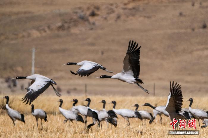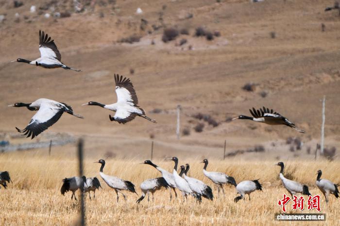 黑颈鹤是中国国家一级保护动物,是唯一生活、繁殖在高原的鹤类,被藏族民众誉为“吉祥鸟”。近日,西藏自治区拉萨市林周县林业和草原局介绍,作为黑颈鹤重要的越冬栖息地,今年该县境内黑颈鹤数量在1800只至2300只之间,其中虎头山水库卡东村一带占比约一半。中新网记者在周边看到,不少黑颈鹤在田间觅食,不时飞翔于高原农田、村落上空,舞动的鹤影和声声鹤鸣为冬春时节的高原增添了几分灵动。图为2月8日,黑颈鹤群在悠闲觅食。江飞波 摄
