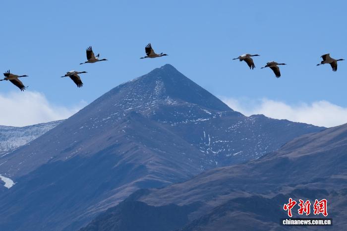 图为2月8日,黑颈鹤群飞翔于高原。江飞波 摄