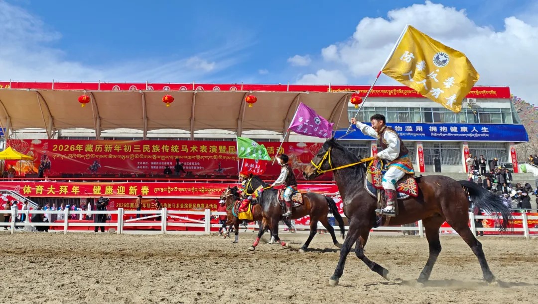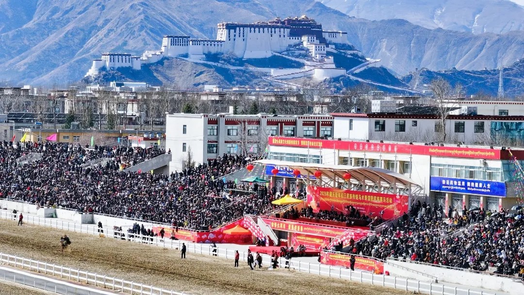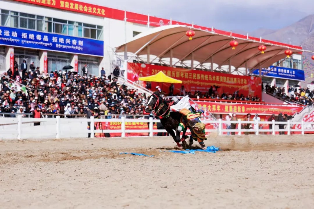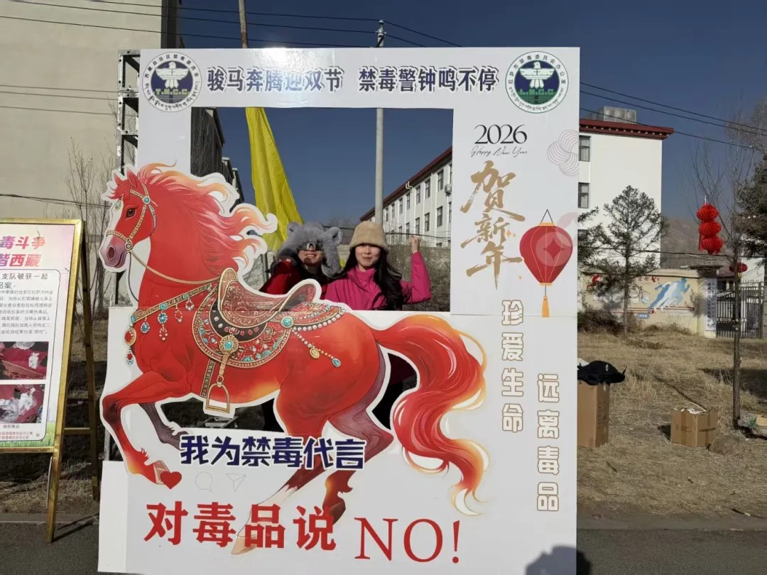 雪域迎春辞旧岁,骏马欢腾庆新年。藏历新年初三,高原大地处处洋溢着喜庆祥和、团结奋进的浓厚节日氛围,在拉萨北郊赛马场,各族群众身着盛装、欢聚一堂,共庆传统佳节,共赏民俗盛宴。2月20日藏历新年初三,西藏自治区禁毒办、拉萨市禁毒办联合西藏自治区体育局在“2026年藏历新年初三民族传统马术表演暨民族赛马活动”现场,植入“防范药物滥用、拒绝毒品危害”为主题的“马术+禁毒”宣传活动,将民俗体育与禁毒宣传深度融合,为节日增添平安底色。