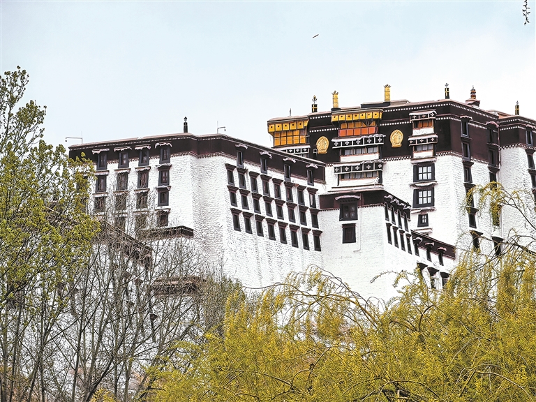 图为春芽掩映下的布达拉宫红白宫墙。