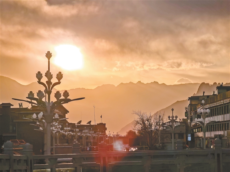 当夕阳的最后一抹余晖染红天际,拉萨迎来了一天中最动人的时刻。金色的霞光如同融化的金子,从山峦间缓缓倾泻,为远处的山脊、城市的街道、错落的建筑镀上一层温暖的光晕。暮色渐浓,烟火气依旧绵长,这抹落日余晖,是一天忙碌生活的温柔收尾,也是夜晚静谧时光的温柔序曲,让“日光城”的黄昏,永远带着治愈人心的力量,藏着说不尽的温柔与美好。