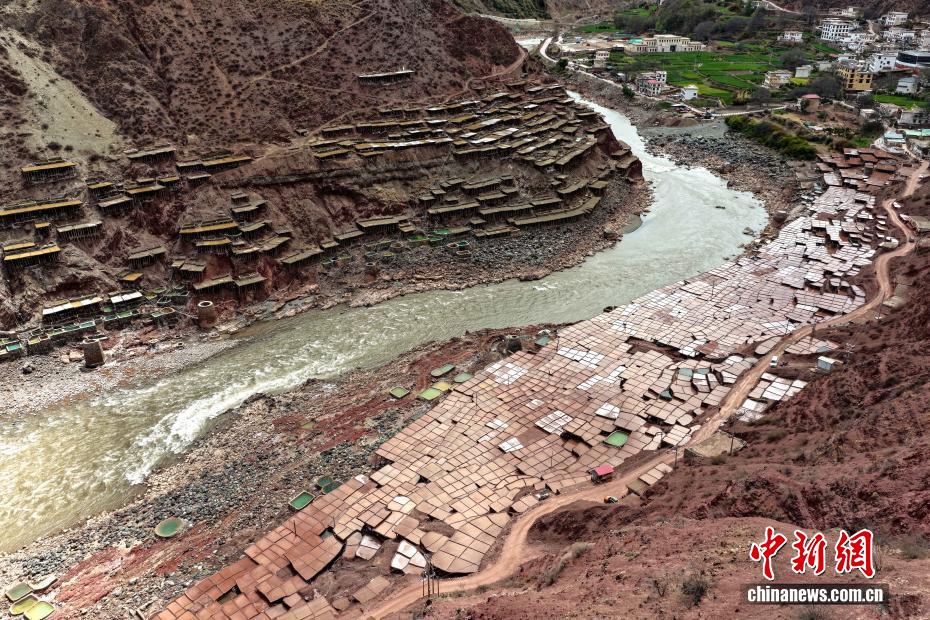 3月24日,西藏昌都市芒康县境内的千年古盐田犹如大地艺术画卷。澜沧江畔,数千块盐田错落分布两岸。当地民众遵循古老传统,引水晒盐,距今已有1300多年的历史。图为当地民众在盐田劳作。中新社记者 李林 摄