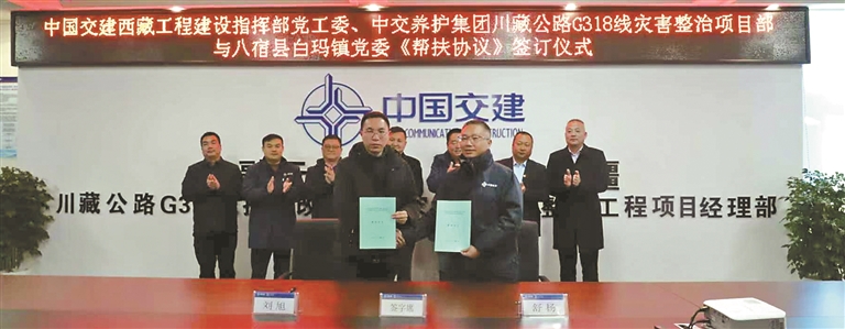 中交养护工程公司G318线灾害整治项目部与八宿县白玛镇签订《帮扶协议》。记者 王莉 摄