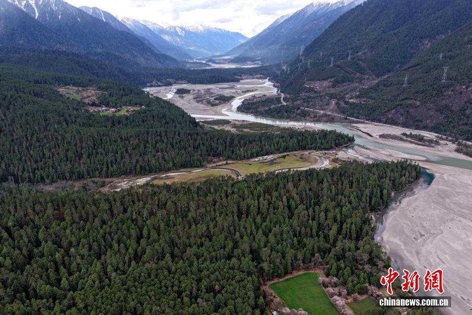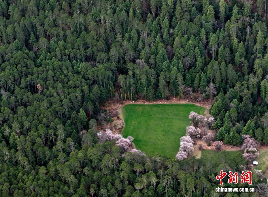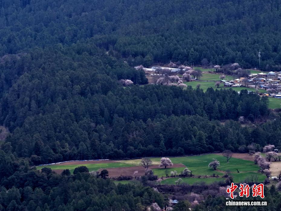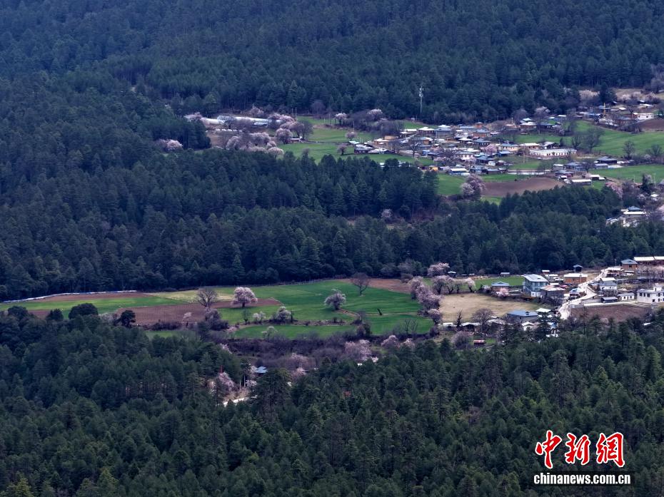 3月26日,西藏波密桃花林海相映成趣。岗云杉林位于西藏林芝市波密县,森林覆盖率达61%以上,海拔2700米左右。俯瞰岗云杉林,周边桃花绽放,与密林、农田构成美丽自然画卷。(无人机照片)中新社记者 李林 摄
