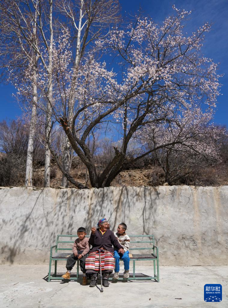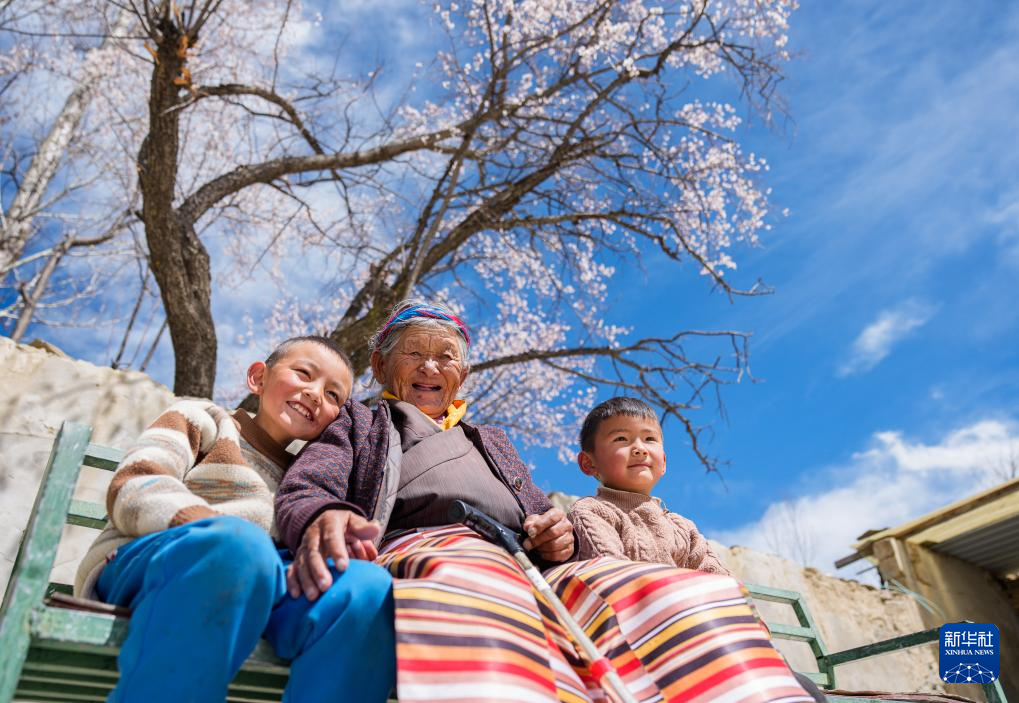 次仁桑姆(中)和两位晚辈在宗卡村家中的院子里聊天(3月26日摄)。新华社记者 丁增尼达 摄