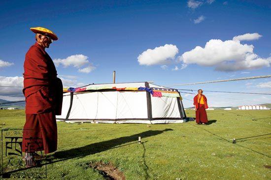 青海玉树珍勤乡草原赛马会僧人在自己搭的帐篷前享受休闲时光。