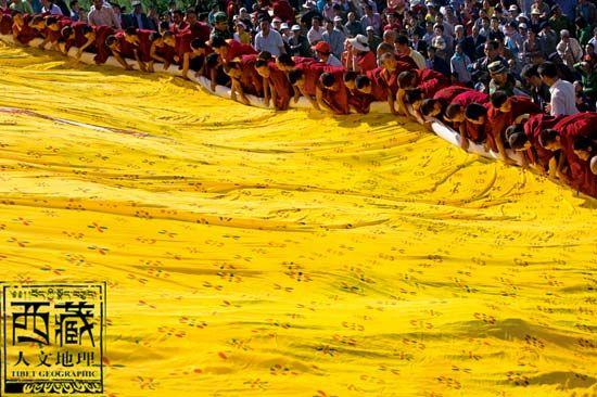 青海塔尔寺晒佛后众僧人在卷巨大的佛像。