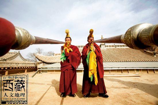 青海同仁吾屯上寺正月跳羌姆时吹法号的僧人。