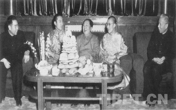 1955年2月24日,毛泽东主席、刘少奇副主席、周恩来总理与十四世达赖喇嘛、十世班禅额尔德尼共度藏历年。