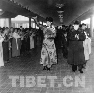二十世纪六十年代,湖北省歌舞团在北京民族文化宫演出歌剧《洪湖赤卫队》,这是十世班禅额尔德尼向演员祝贺演出成功。