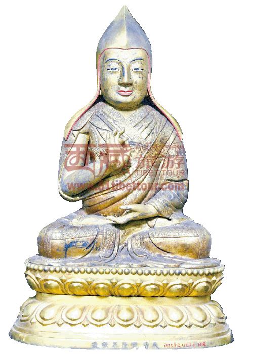 【形态】高70多厘米,六世班禅头戴桃形帽,身着法衣,面部慈祥,右手当胸,作说法印,造型饱满、圆润。