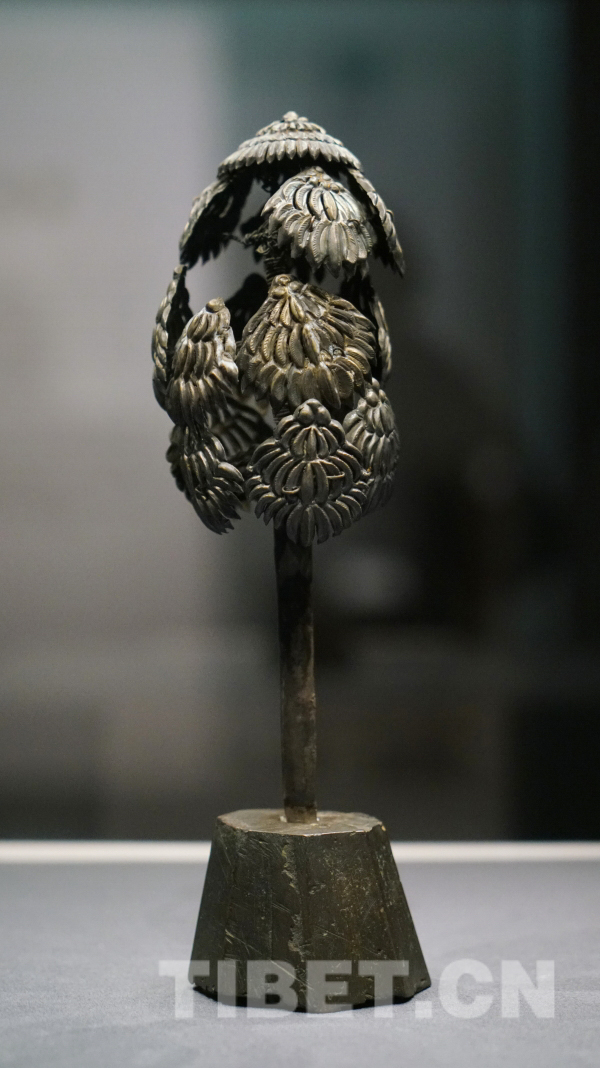 菩提树以银杆外包银片作树干,插在八角锥体台座上,银丝拧成绳状作树枝,卵形树冠,16片弧边三角形树叶。